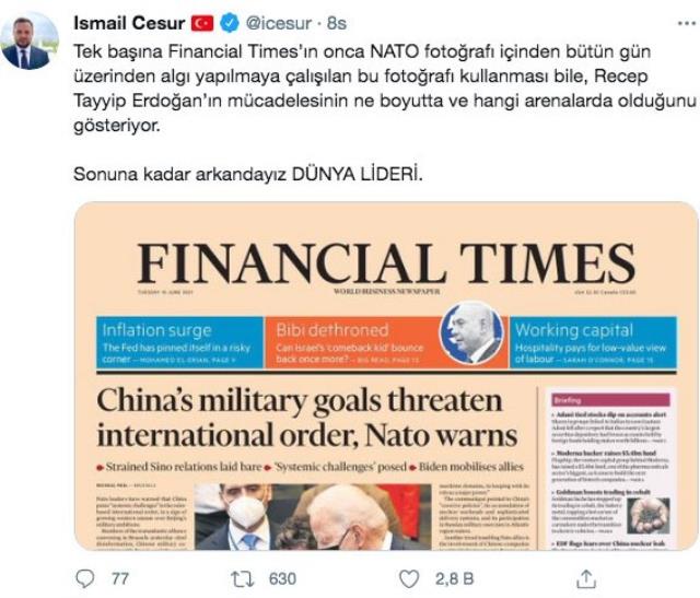 Cesur, konuyla ilgili sosyal medya hesabından yaptığı değerlendirmede "Tek başına Financial Times'ın onca NATO fotoğrafı içinden bütün gün üzerinden algı yapılmaya çalışılan bu fotoğrafı kullanması bile, Recep Tayyip Erdoğan'ın mücadelesinin ne boyutta ve hangi arenalarda olduğunu gösteriyor. Sonuna kadar arkandayız Dünya Lideri." ifadelerine yer verdi.
