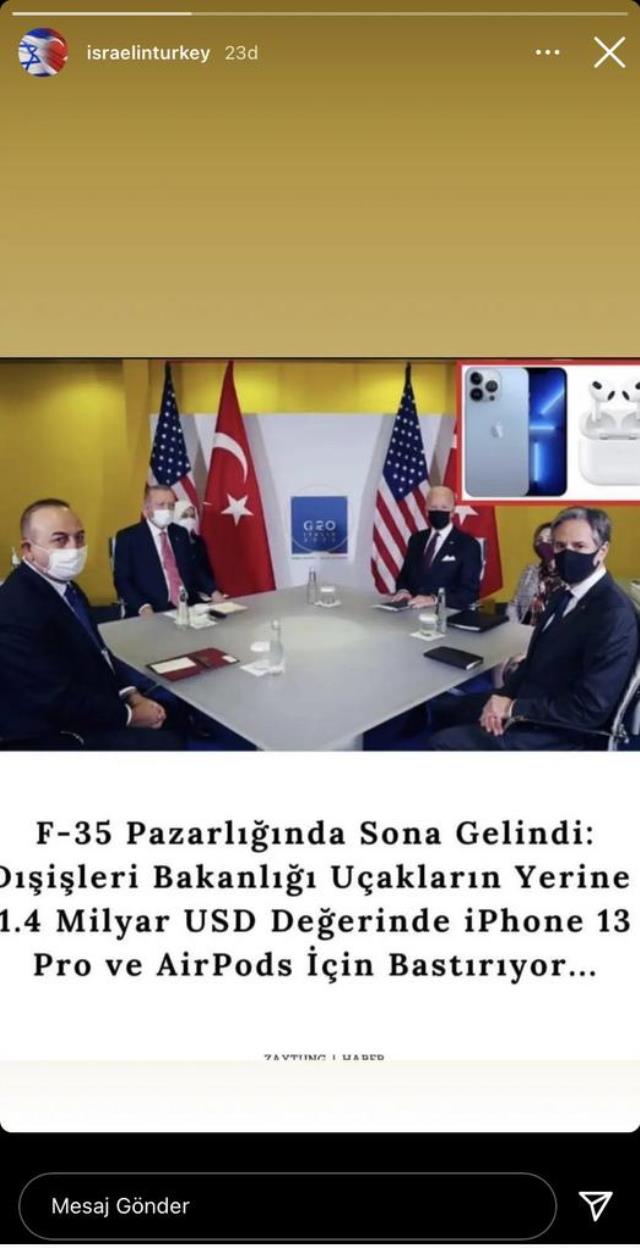 Türkiye'deki İsrail Büyükelçiliği'nin resmi hesabı olan ve "IsraelinTurkey" kullanıcı adıyla faaliyet gösteren sosyal medya hesabından bugün skandal bir paylaşıma imza atıldı. Instagram hikayesi olarak paylaşılan gönderide Türkiye ve ABD arasındaki F-35 gerginliği alaya alınarak, "Dışişleri uçaklar (F-35) yerine iPhone 13 Pro için bastırıyor" denildi.