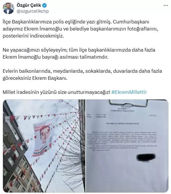 “İlçe Başkanlıklarımıza polis eşliğinde yazı gitmiş. Cumhurbaşkanı adayımız Ekrem İmamoğlu ve belediye başkanlarımızın fotoğraflarını, posterlerini indirecekmişiz. Ne yapacağımızı söyleyeyim; tüm ilçe başkanlıklarımızda daha fazla Ekrem İmamoğlu bayrağı asılması talimatımdır. Evlerin balkonlarında, meydanlarda, sokaklarda, duvarlarda daha fazla göreceksiniz Ekrem Başkanı. Millet iradesinin yüzünü size unutturmayacağız.”