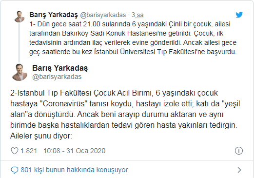 Yarkadaş, "Çinli çocuğun tedavi altına alındığı bölgede tam anlamıyla bir 'karantina' yok. Aynı katta başka çocuklar da var. Personel ise sadece maske takıyor" diye yazdı.