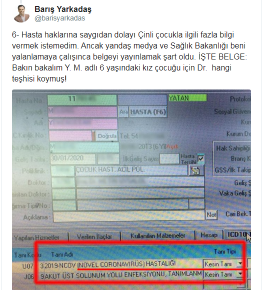 Daha sonra bir açıklama daha yapan Yarkadaş, "Hasta haklarına saygıdan dolayı Çinli çocukla ilgili fazla bilgi vermek istemedim. Ancak yandaş medya ve Sağlık Bakanlığı beni yalanlamaya çalışınca belgeyi yayınlamak şart oldu. İŞTE BELGE: Bakın bakalım Y. M. adlı 6 yaşındaki kız çocuğu için Dr. hangi teşhisi koymuş!" ifadelerini kullandı.