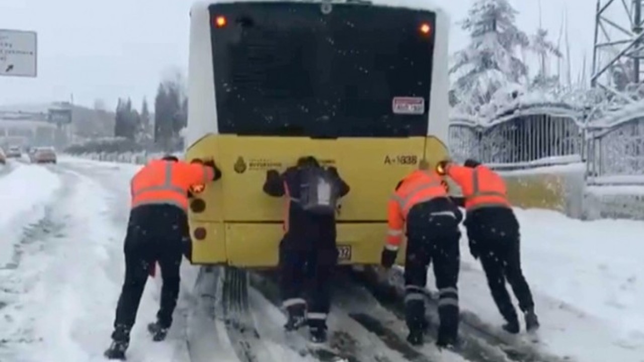 Mahsur kalan İETT otobüsü, vatandaşların yardımıyla itilerek bulunduğu yerden hareket ettirildi.