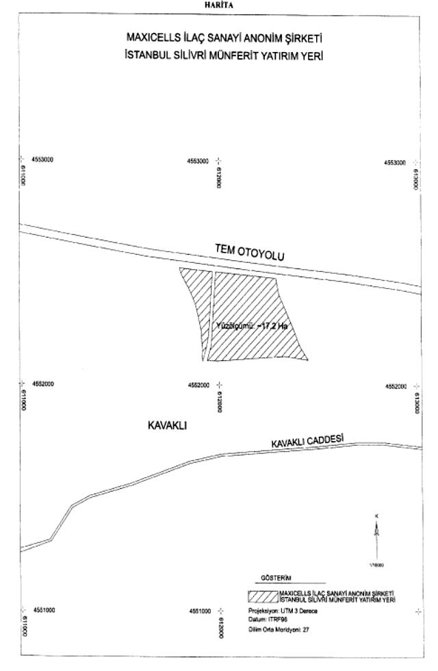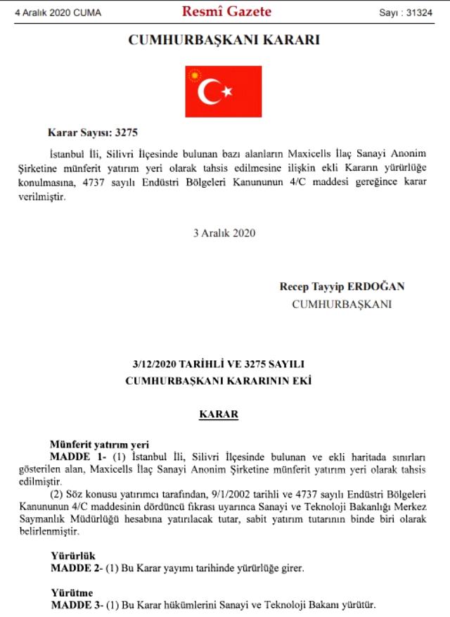 "İstanbul ili, Silivri ilçesinde bulunan ve ekli haritada sınırları gösterilen alan, Maxicells İlaç Sanayi Anonim Şirketine münferit yatırım yeri olarak tahsis edilmiştir. Söz konusu yatırımcı tarafından Sanayi ve Teknoloji Bakanlığı Merkez Saymanlık Müdürlüğü hesabına yatırılacak tutar, sabit yatırım tutarının binde biri olarak belirlenmiştir."