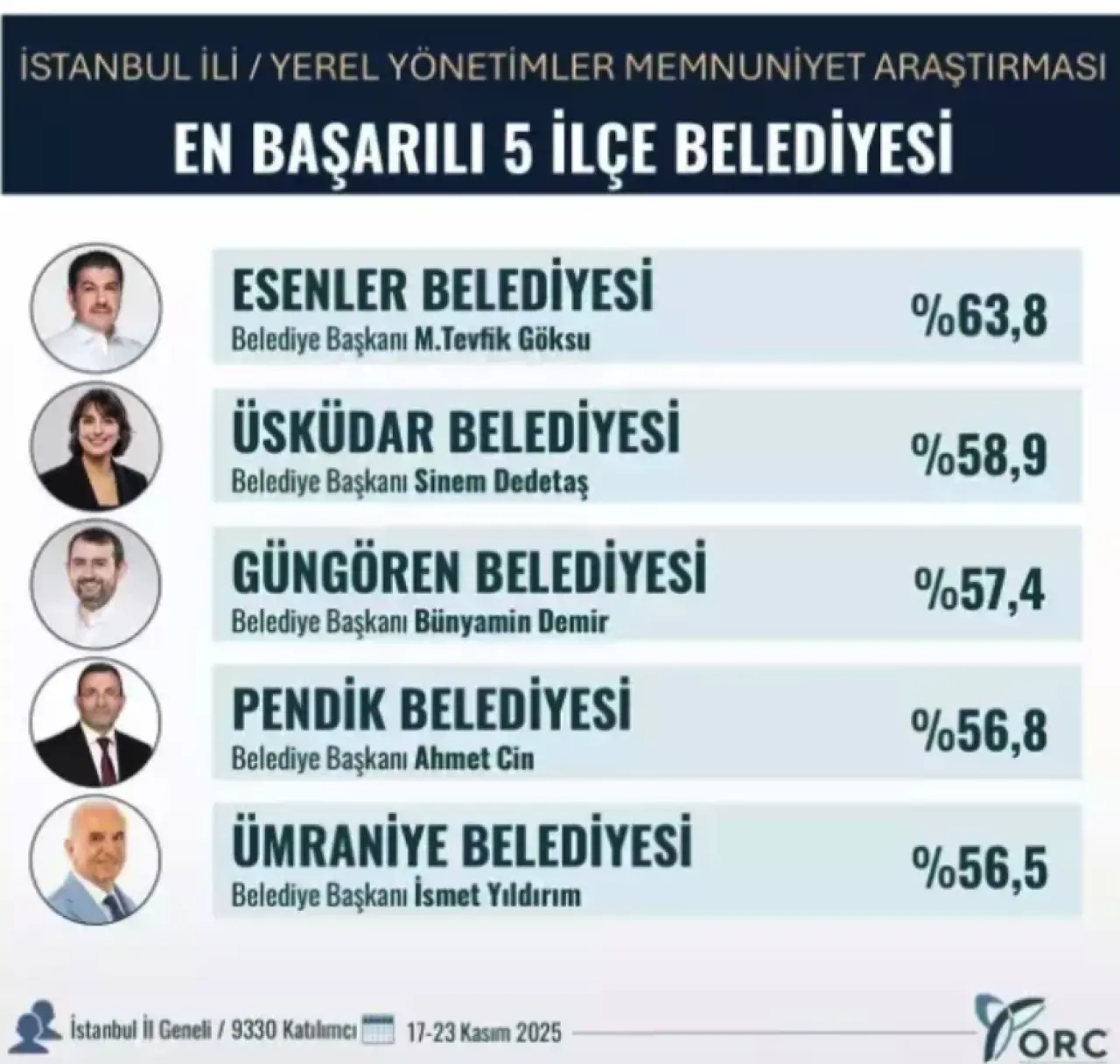 ORC Araştırma, İstanbul genelinde yaptığı Yerel Yönetimler Memnuniyet Araştırması'nın sonuçları paylaştı. Araştırmaya göre, İstanbul’daki belediyelerin başarısı ortaya çıktı.