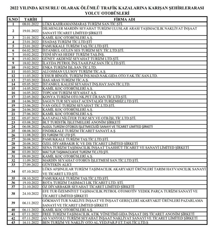"Bu kapsamda, 1 Ocak 2022-27 Kasım 2022 tarihleri arasında meydana gelen şehirler arası tarifeli ve tarifesiz yolcu taşımacılığı yapan otobüslerin kusurlu olarak karıştığı 43 ölümlü trafik kazasında, olay yerinde 83 can kaybı meydana gelmiştir. Ölümlü trafik kazalarına 36 farklı otobüs firmasının karıştığı tespit edilmiş, ilk sırada 6 ölümlü ve 18 yaralanmalı trafik kazasıyla Kamil Koç Otobüsleri A.Ş. firması yer almıştır."