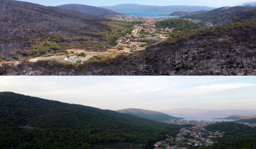Yangın öncesi yemyeşil olan ilçe yangından sonra siyaha bürünmüş haliyle görenlerin yüreğini sızlattı.