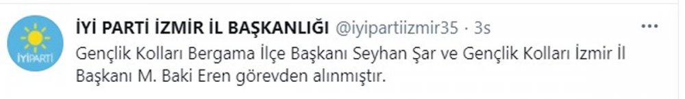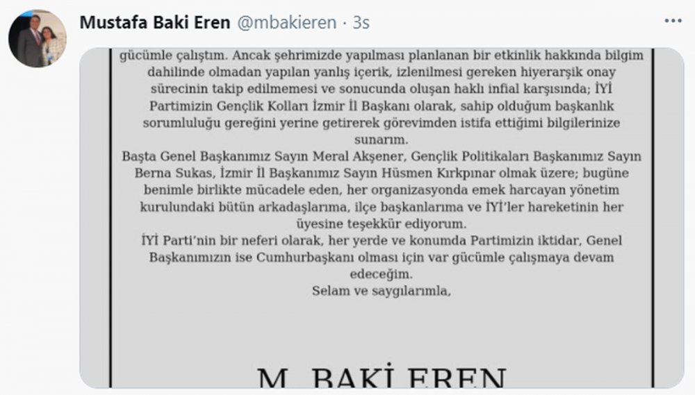 Öte yandan İYİ Parti Gençlik Kolları İzmir İl Başkanı Baki Eren ise görevinden istifa ettiğini belirtti. Sosyal medya hesabından bir açıklama paylaşan Eren, “İYİ Parti’mizin Gençlik Kolları İzmir İl Başkanı olarak sahip olduğum başkanlık sorumluluğu gereğini yerine getirerek görevimden istifa ettiğimi bilgilerinize sunarım” dedi.