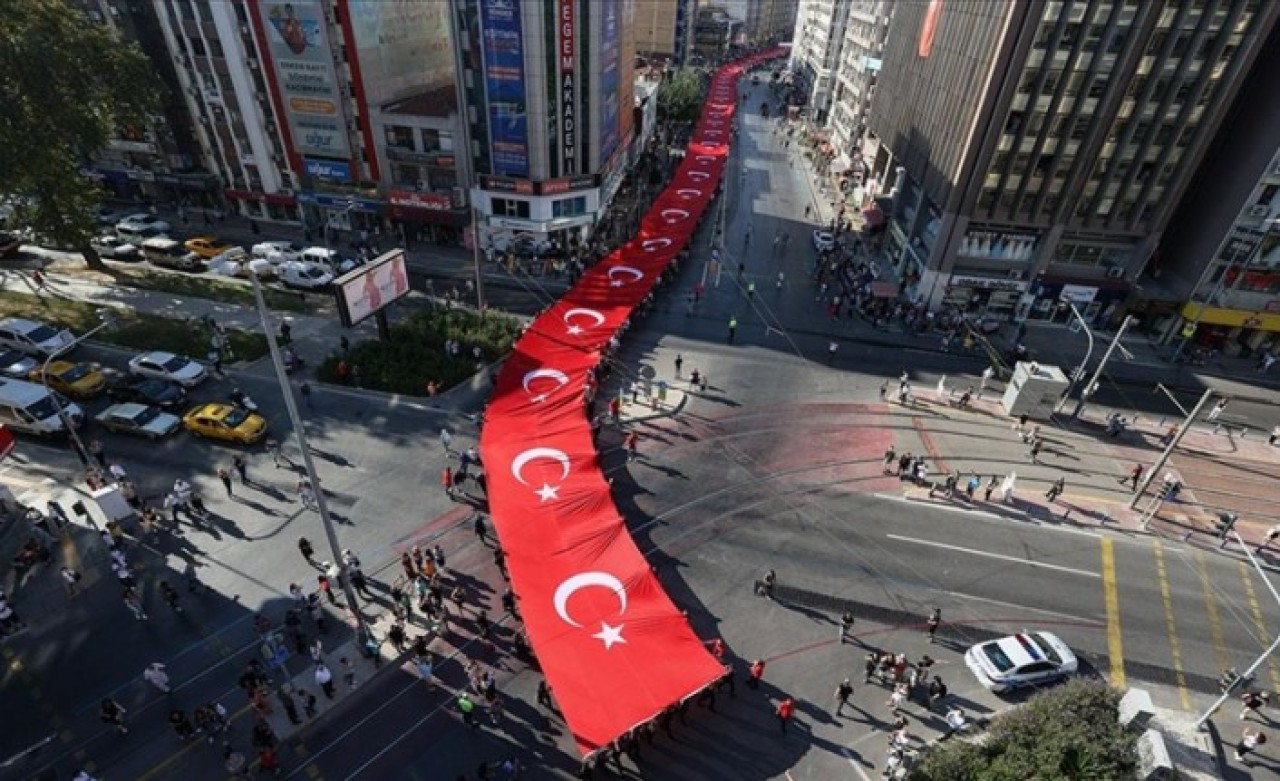 Türk ordusunun 100 yıl önce bugün İzmir'e girerken kullandığı tarihi güzergah üzerinde düzenlenen yürüyüşte Gaziler, Anafartalar ve İkiçeşmelik caddelerini takip eden İzmirliler, 350 metre uzunluğundaki dev Türk bayrağını birlikte taşıdı.