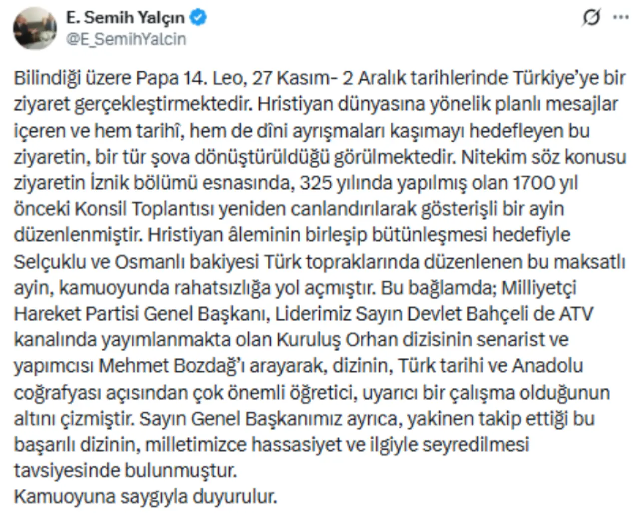 "Bilindiği üzere Papa 14'üncü Leo, 27 Kasım-2 Aralık tarihlerinde Türkiye'ye bir ziyaret gerçekleştirmektedir. Hristiyan dünyasına yönelik planlı mesajlar içeren ve hem tarihi, hem de dini ayrışmaları kaşımayı hedefleyen bu ziyaretin, bir tür şova dönüştürüldüğü görülmektedir. Nitekim söz konusu ziyaretin İznik bölümü esnasında, 325 yılında yapılmış olan 1700 yıl önceki Konsil toplantısı yeniden canlandırılarak gösterişli bir ayin düzenlenmiştir. Hristiyan aleminin birleşip bütünleşmesi hedefiyle Selçuklu ve Osmanlı bakiyesi Türk topraklarında düzenlenen bu maksatlı ayin, kamuoyunda rahatsızlığa yol açmıştır. Bu bağlamda, Milliyetçi Hareket Partisi Genel Başkanı, liderimiz Sayın Devlet Bahçeli de 'Kuruluş Orhan' dizisinin senarist ve yapımcısı Mehmet Bozdağ'ı arayarak, dizinin Türk tarihi ve Anadolu coğrafyası açısından çok önemli öğretici, uyarıcı bir çalışma olduğunun altını çizmiştir. Sayın Genel Başkanımız ayrıca, yakinen takip ettiği bu başarılı dizinin, milletimizce hassasiyet ve ilgiyle seyredilmesi tavsiyesinde bulunmuştur" ifadelerini kullandı.