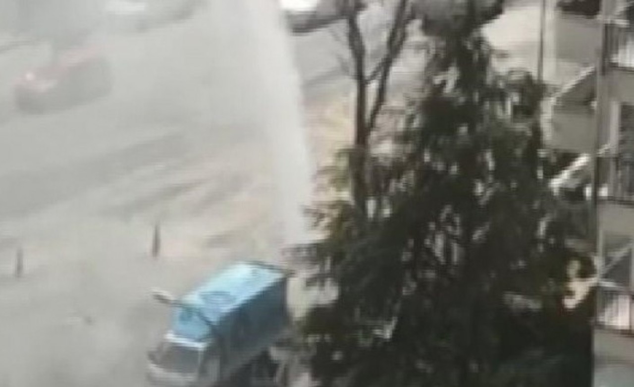 Kırılan borudaki su, basıncın etkisiyle tazyikle fışkırarak yola aktı.