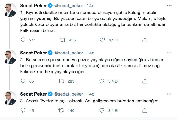 Peker'in Dubai'de kaldığı otelin görüntüleri, sosyal medyada yayınlandı. Kaldığı yer deşifre olunca panikleyen Peker, ailesiyle birlikte oteli terketme kararı aldı. Peker, Twitter hesabından şu paylaşımlarda bulundu: