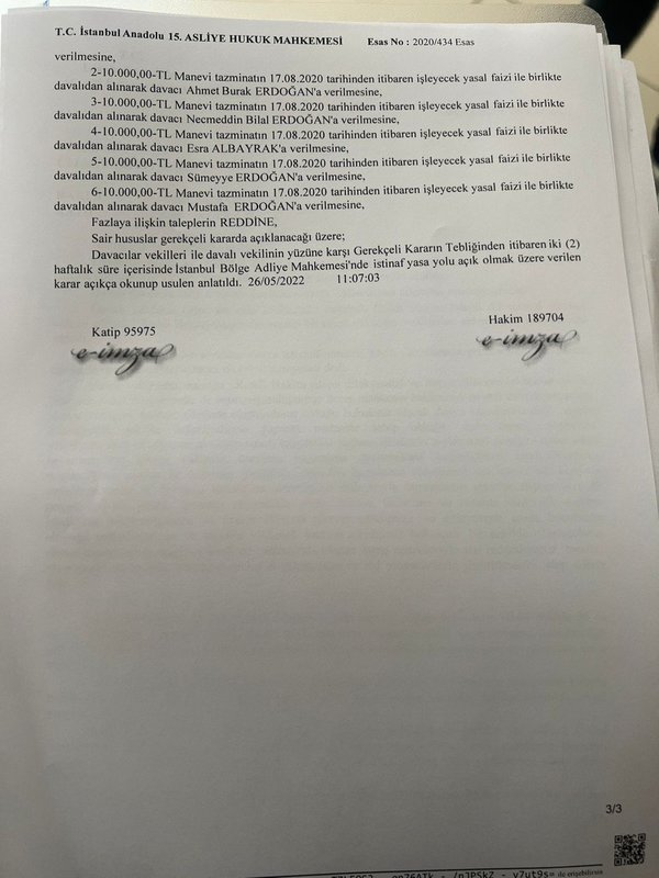 Davanın kısmen kabulüne karar veren mahkeme, Kılıçdaroğlu'nun Cumhurbaşkanı Erdoğan'a 50 bin lira, Ahmet Burak Erdoğan, Necmeddin Bilal Erdoğan, Esra Albayrak, Sümeyye Erdoğan Bayraktar ve Mustafa Erdoğan'a 10'er bin lira manevi tazminatın 17 Ağustos 2020'den itibaren işleyecek yasal faiziyle ödemesine hükmetti.