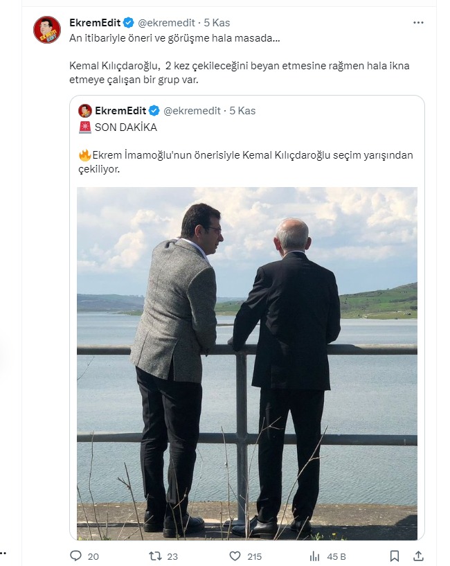 “Evet, ikinci tura katılmama yönünde bir kararım oldu. Divan Başkanı olan Ekrem İmamoğlu ile bu konuyu bir odada görüştük. ‘Özgür Beyi de çağırsın, ben elini de kaldırayım' dedim. Fakat daha genel kurul salonuna gitmeden @ekremedit diye bir twitter hesabı var galiba. O hesapta farklı bir dille sanki bunu bir talimatla yapıyormuşum gibi tweet atıldı. Bu tweet hesabının Ekrem Beye yakın olduğu söylendi.