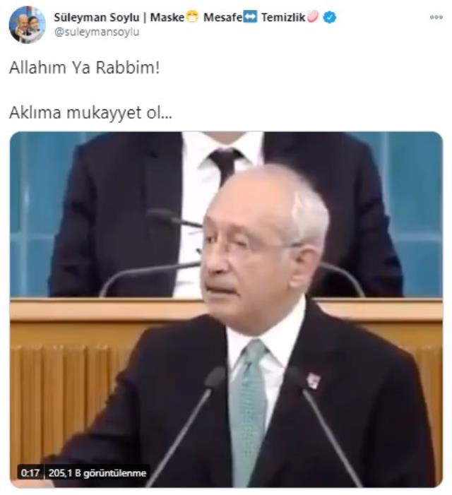 İçişleri Bakanı Süleyman Soylu, sosyal medya hesabından Kemal Kılıçdaroğlu'na tepki gösterdi. Kılıçdaroğlu'nun sözlerinin yer aldığı videoyu paylaşan Bakan Soylu, "Allah'ım ya Rabbim! Aklıma mukayyet ol" dedi.