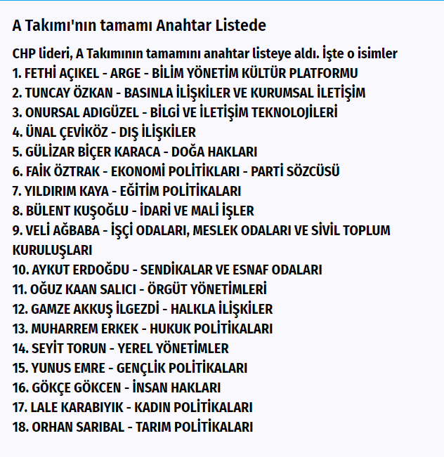 MYK'nın tamamı ve bölge milletvekilleri anahtar listede yer alırken, Anadolu ağırlığı dikkat çekti. Sivas Milletvekili Ulaş Karasu, Kastamonu Milletvekili Hasan Baltacı, Samsun Milletvekili Neslihan Hancıoğlu, Bursa Milletvekili Nurhayat Kayışoğlu, Balıkesir Milletvekili Ahmet Akın, Niğde Milletvekili Ömer Fethi Gürer ve Kahramanmaraş Milletvekili Ali Öztunç listede yer alan isimler oldu.