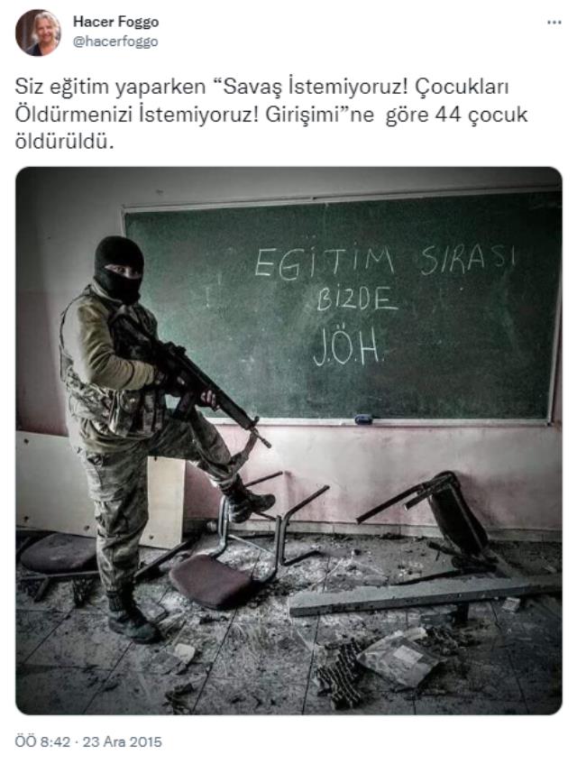 Jandarma Özel Harekat'ın Hendek operasyonları sırasında bir sınıfta çekilen ve tahtada "Eğitim sırası bizde J.Ö.H" ifadelerinin yer aldığı bir fotoğrafı paylaşan Foggo'nun, attığı tweet'e ise "Siz eğitim yaparken "Savaş İstemiyoruz! Çocukları Öldürmenizi İstemiyoruz! Girişimi"ne göre 44 çocuk öldürüldü" notunu düştüğü görüldü.