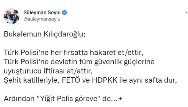 Kılıçdaroğlu'nun bu paylaşımına İçişleri Bakanı Süleyman Soylu'dan sert bir cevap geldi. Kılıçdaroğlu için "Bukalemun" ifadesini kullanan Bakan Soylu, "Türk Polisi'ne her fırsatta hakaret et/ettir, Türk Polisi'ne devletin tüm güvenlik güçlerine uyuşturucu iftirası at/attır, şehit katilleriyle, FETÖ ve HDPKK ile aynı safta dur, Ardından 'yiğit polis göreve' de. Merak etme Kılıçdaroğlu, Türk Polisi, katilleri de, devlet-millet düşmanlarını da, teröristler ile el ele tutuşanları da, ikiyüzlüleri de iyi bilir" dedi.
