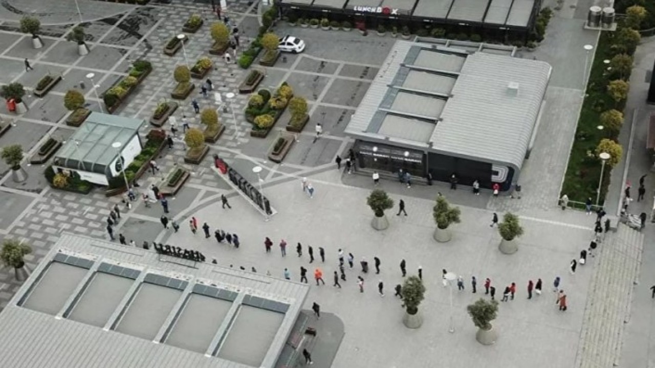 Alışveriş merkezinin önünde oluşan kuyruk havadan fotoğraflandı.