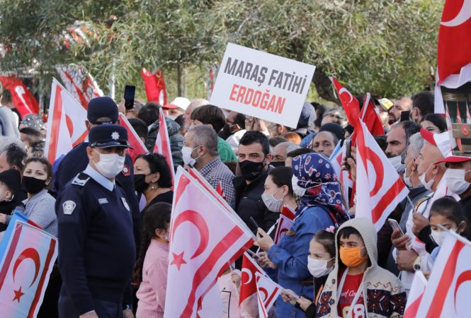 Ziyaret sırasında Maraş'taki binalardaki KKTC ve Türk bayrakları dikkat çekerken, "Maraş Fatihi Erdoğan" yazılı bir pankart açıldığı görüldü.