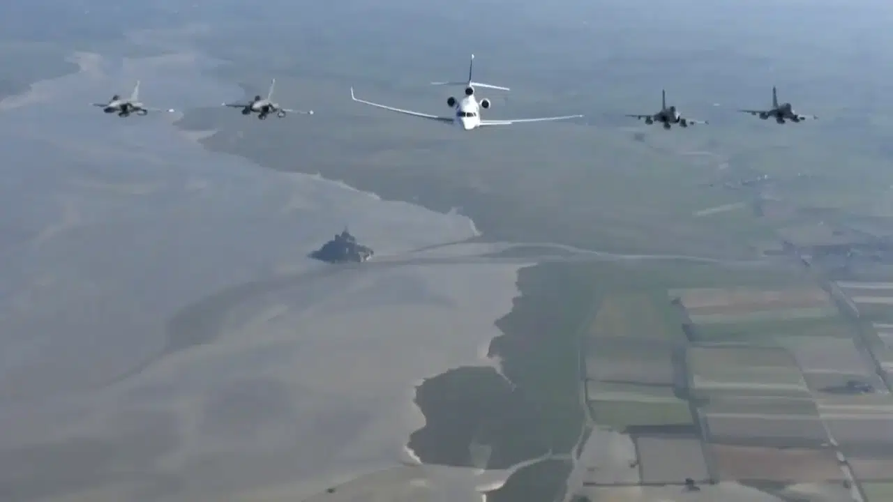 Macron’un uçağının Mont Saint-Michel Körfezi üzerinde Rafale jetleriyle birlikte uçtuğu anlara ait görüntülerin sosyal medyada paylaşıldığı aktarıldı. Haberde, bu görüntülerin geniş yankı uyandırdığı kaydedildi.