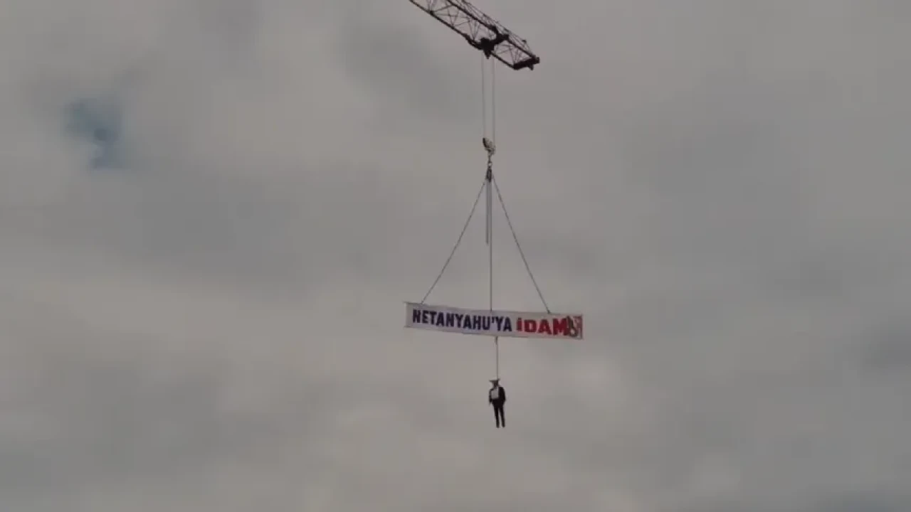 Vatandaşlar, İsrail Başbakanı Binyamin Netanyahu'nun maketini vinçle asıp idam edermişçesine gösteri yaptı. Bu olay, yerel halkın duygusal tepkisini açıkça ortaya koyuyor.