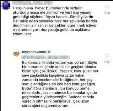 Instagram'da bir takipçisinin "Her gün ana bültenlerinde sizlerin oturduğu masa ele alınıyor ve yurt dışı yasağı getirildiği söylendi. Şimdi yıllardır sizi takip edenlere bir açıklama borçlu değil misiniz?" yorumuna cevap veren Feyza Hakyemez Başar, "Bu konuda ilk defa yorum yapıyorum.
