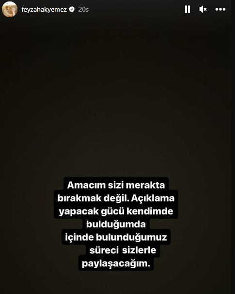Çok uzun süreceğini düşünmüyorum" ifadesinde bulunması üzerine sosyal medya hesabından paylaşım yapan fenomen Feyza Hakyemez, "Amacım sizi merakta bırakmak değil. Açıklama yapacak gücü kendimde bulduğumda içinde bulunduğumuz süreci sizlerle paylaşacağım" ifadelerini kullanarak eşi Muhammet Oğuz Başar ile pozunu yayınladı.