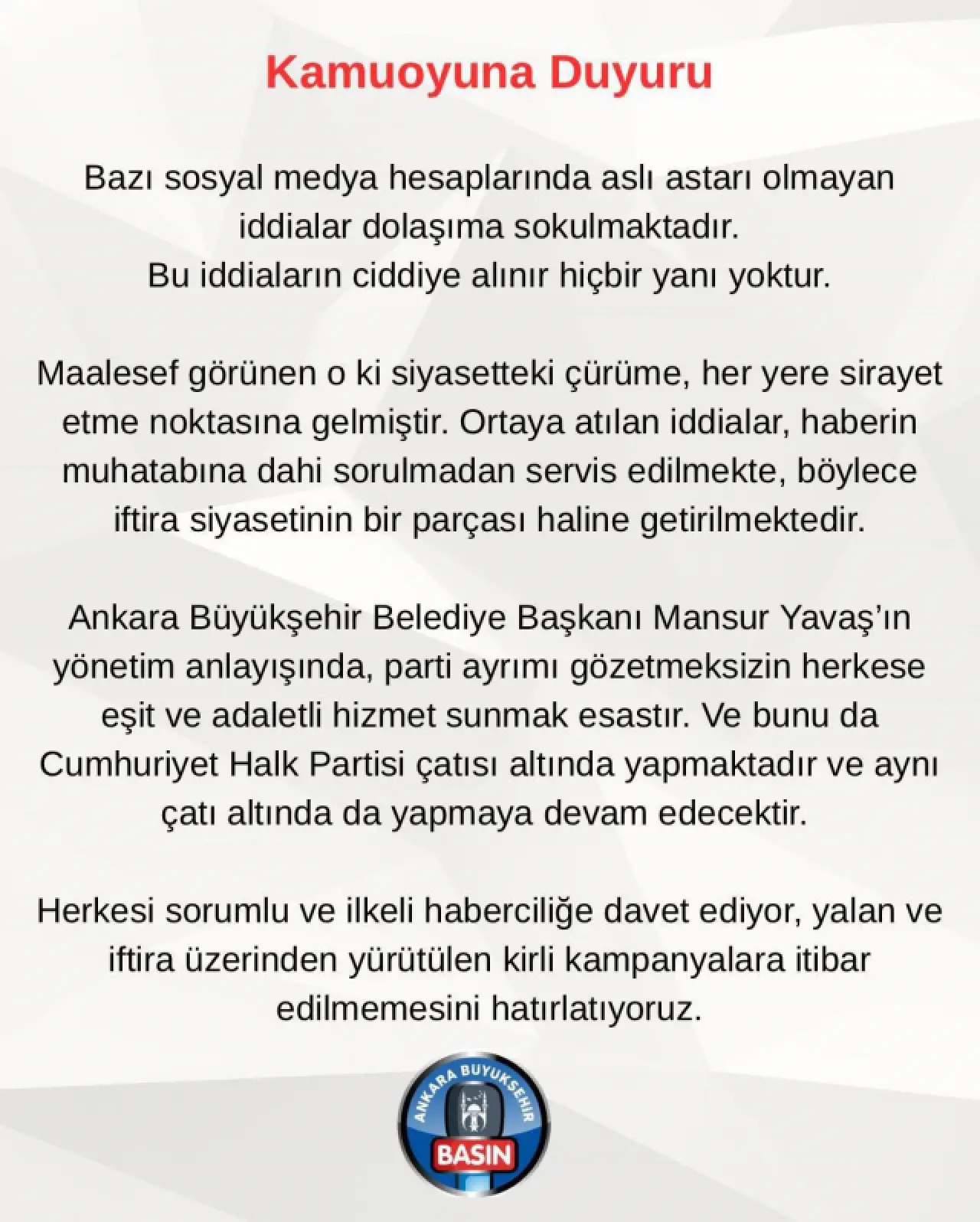 Ankara Büyükşehir Belediyesi Basın Birimi, söz konusu iddialara yazılı bir açıklamayla yanıt verdi. Açıklamada şu ifadelere yer verildi: "Bazı sosyal medya hesaplarında aslı astarı olmayan iddialar dolaşıma sokulmaktadır. Bu iddiaların ciddiye alınır hiçbir yanı yoktur. Maalesef siyasetteki çürüme, her yere sirayet etme noktasına gelmiştir. Ortaya atılan iddialar, haberin muhatabına dahi sorulmadan servis edilmekte, böylece iftira siyasetinin bir parçası haline getirilmektedir"