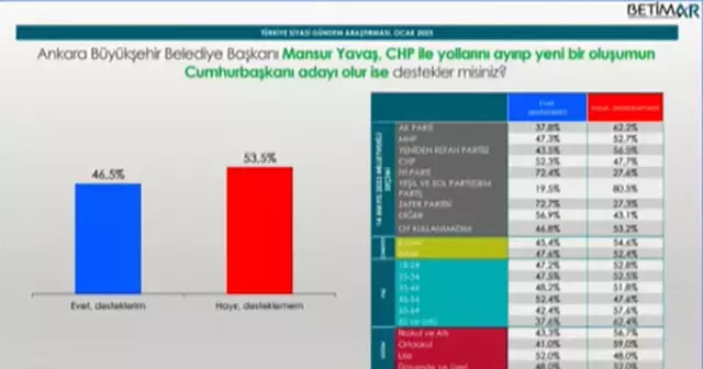 BETİMAR Araştırma, Mansur Yavaş’ın CHP’den ayrılarak yeni bir oluşumun cumhurbaşkanı adayı olması halinde halkın nasıl tepki vereceğini ölçtü. Katılımcılara “Mansur Yavaş, CHP’den ayrılıp yeni bir oluşumun cumhurbaşkanı adayı olur ise destekler misiniz?” sorusu yöneltildi.