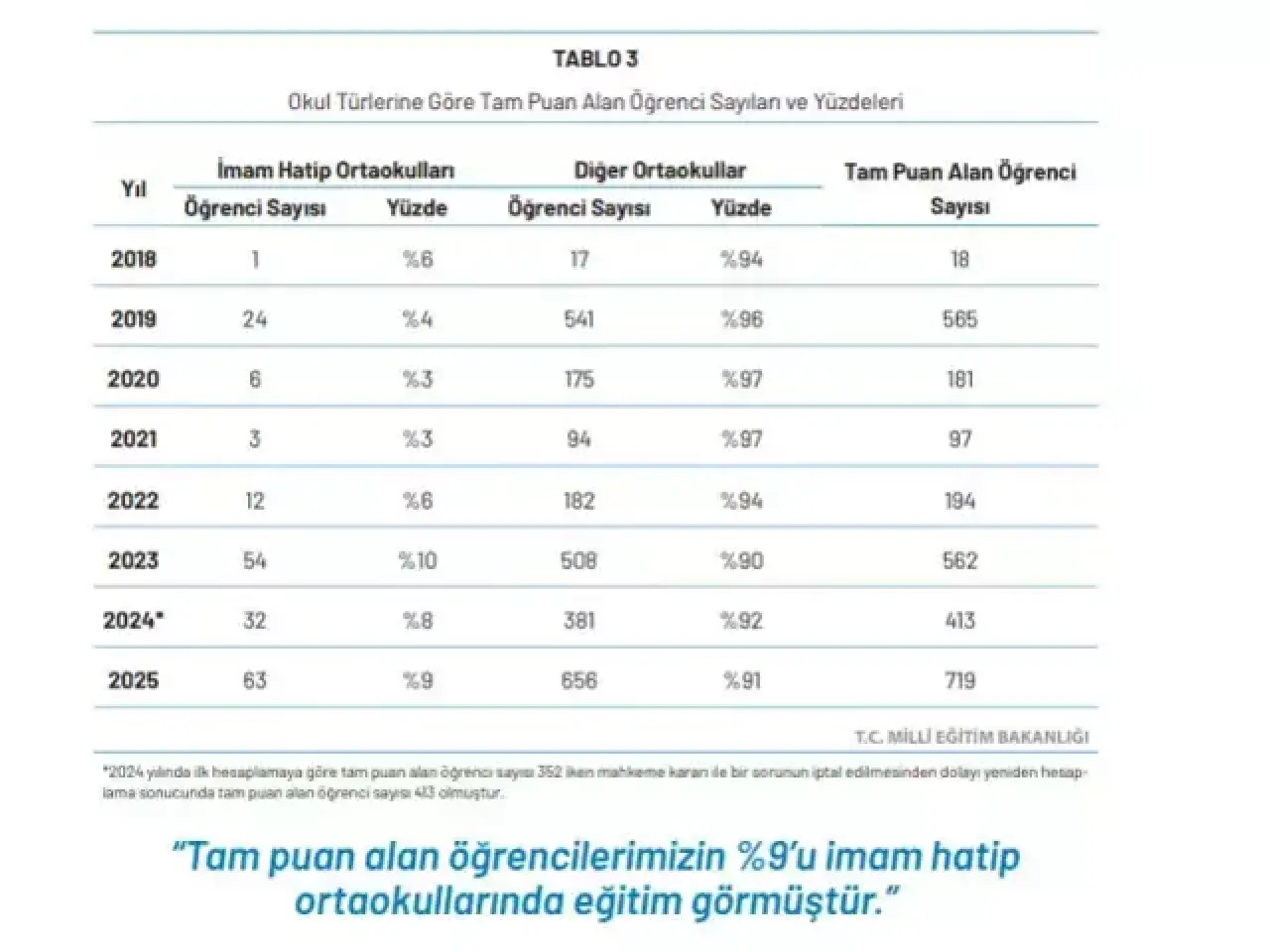 Tam puan alan öğrencilerin yıllara göre dağılımı raporda paylaşılırken, 2025 yılında sınavda tam puan alan öğrencilerin okullara göre dağılımını içeren istatistiğe de yer verilerek, "Tam puan alan öğrencilerimizin %9'u imam hatip ortaokullarında eğitim görmüştür" değerlendirilmesinde bulunuldu.