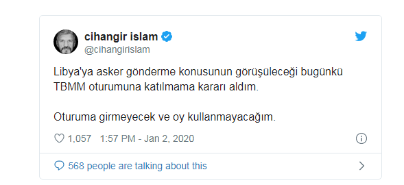 Ancak Saadet Partisi İstanbul Milletvekili Cihangir İslam, Twitter hesabından yaptığı açıklamada "Libya'ya asker gönderme konusunun görüşüleceği bugünkü TBMM oturumuna katılmama kararı aldım. Oturuma girmeyecek ve oy kullanmayacağım" değerlendirmesinde bulundu.