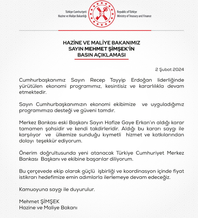 "Merkez Bankası eski Başkanı Sayın Hafize Gaye Erkan’ın aldığı karar tamamen şahsidir ve kendi takdirleridir. Aldığı bu kararı saygı ile karşılıyor ve ülkemize sunduğu kıymetli hizmet ve katkılarından dolayı teşekkür ediyorum. Önerim doğrultusunda yeni atanacak Türkiye Cumhuriyet Merkez Bankası Başkanı ve ekibine başarılar diliyorum."