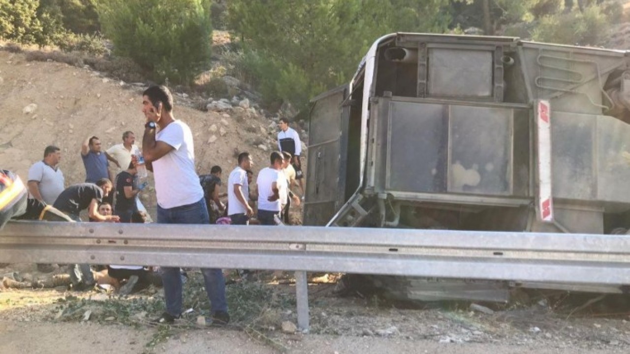 KKTC’ye sevk edilen askerleri Mersin’e götürmek için yola çıkan Alaşehir Sarıkız Turizm firmasına ait sürücüsü öğrenilemeyen otobüs, Mut-Karaman karayolu Zeytinalanı mevkisinde virajı alamayarak şarampole devrildi.