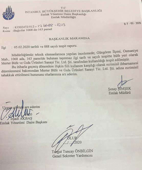 Emlak Müdürlüğü, Güngören’deki Osmaniye Mahallesi’nde Merter Metro istasyonu ve otobüs durağının hemen yanı başında bulunan büfenin, Merter Büfe ve Gıda Ürünleri Sanayi Ticaret Şirketi tarafından kullanıldığını tespit etti.