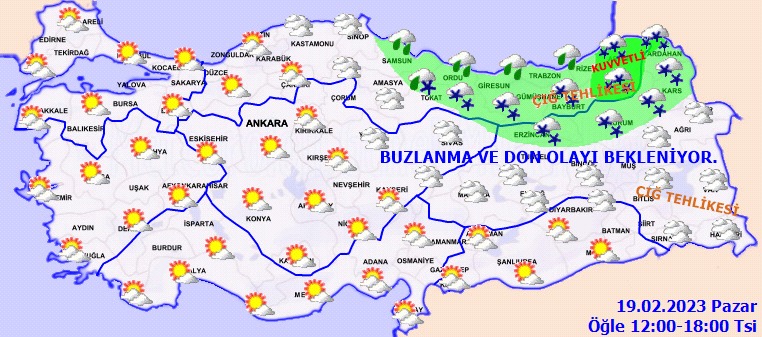 Meteoroloji Genel Müdürlüğü tarafından yapılan son değerlendirmelere göre: Ülkemizin kuzey, iç ve doğu kesimlerinin parçalı ve çok bulutlu, Orta ve Doğu Karadeniz kıyılarının yağmurlu, Tokat'ın kuzey ve doğusunun yağmur ve karla karışık yağmurlu, Doğu Karadeniz’in iç kesimleri ile Sivas, Erzincan, Erzurum, Kars, Ardahan ve Van çevrelerinin kar yağışlı, diğer yerlerin az bulutlu ve açık geçeceği tahmin ediliyor. Yağışların; Rize'nin doğusu, Artvin çevreleri ile Ardahan'ın kuzeyinde kuvvetli ve yer yer yoğun kar şeklinde olması bekleniyor. İç ve doğu kesimlerde buzlanma ve don olayı ile birlikte yer yer pus ve sis bekleniyor. Doğu Karadeniz’in iç kesimleri ile Doğu Anadolu’nun eğimli ve yüksek yamaçlarda çığ tehlikesi riski bulunmaktadır.