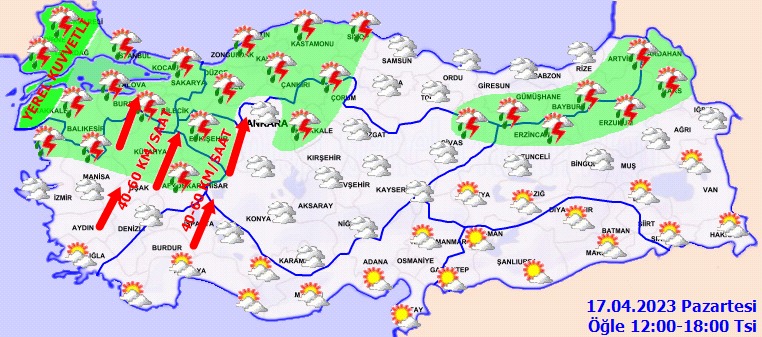 KUVVETLİ YAĞIŞ UYARISI: Yağışların; öğle saatlerinden sonra Çanakkale, Edirne, Kırklareli ve Tekirdağ çevrelerinde yerel kuvvetli olması beklendiğinden ani sel, su baskını, yıldırım, yerel dolu yağışı ve kuvvetli rüzgâr gibi olumsuzluklara karşı dikkatli ve tedbirli olunması gerekmektedir.