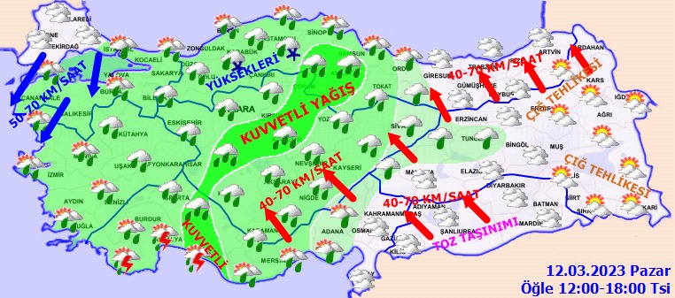 Meteoroloji Genel Müdürlüğü tarafından yapılan son değerlendirmelere göre: Ülkemiz genelinin parçalı ve çok bulutlu, Marmara, Ege, Akdeniz, İç Anadolu, Batı ve Orta Karadeniz, Giresun, Erzincan ve Tunceli ile Malatya'nın kuzey ve batı çevrelerinin yağmur ve sağanak, yer yer gök gürültülü sağanak yağışlı geçeceği tahmin ediliyor. Yağışların, Batı Akdeniz, İç Anadolu'nun kuzeybatısı, Orta Karadeniz ile Muğla, Denizli, Uşak, Afyonkarahisar, Konya, Aksaray, Nevşehir ve Sinop çevrelerinin kuvvetli, Antalya'nın kuzey ve doğusunda çok kuvvetli olması bekleniyor. Doğu Karadeniz’in iç kesimleri ile Doğu Anadolu’nun eğimli ve yüksek kesimlerinde çığ tehlikesi riski bulunmaktadır.
