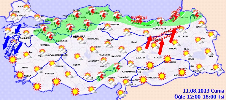 KUVVETLİ YAĞIŞ UYARISI: Yağışların, Batı Karadeniz kıyıları, Sakarya, Kastamonu, Ordu, Giresun ve Rize çevreleri ile Artvin’in kıyı kesimlerinde yer yer kuvvetli olması beklendiğinden yaşanabilecek olumsuzluklara karşı dikkatli ve tedbirli olunmalıdır.