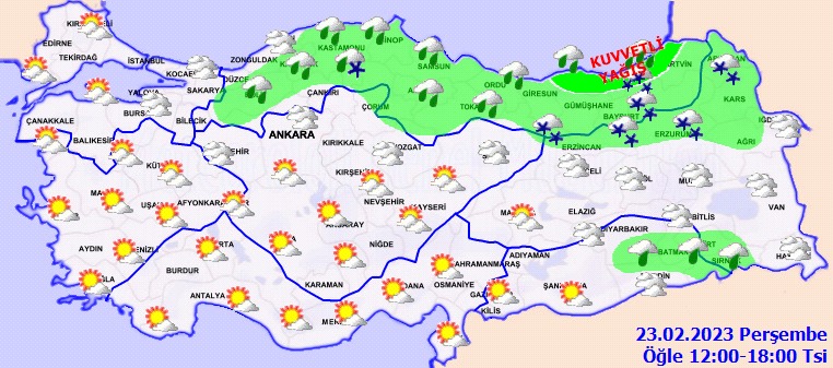 Meteoroloji Genel Müdürlüğü tarafından yapılan son değerlendirmelere göre; Orta ve Doğu Karadeniz, Batı Karadeniz'in iç kesimleri, Doğu Anadolu'nun kuzey ve doğusu ile Kastamonu kıyıları, Sinop, Batman ve Siirt çevrelerinin yerel olmak üzere yağmurlu, Doğu Karadeniz’in iç kesimleri ile Kastamonu'nun iç kesimleri ve Doğu Anadolu'nun kuzey ve doğusunda karla karışık yağmur ve kar yağışlı, diğer yerlerin az bulutlu ve açık geçeceği tahmin ediliyor. Yağışların; Trabzon, Rize ve Artvin kıyılarında kuvvetli olması bekleniyor. İç ve doğu kesimlerde buzlanma ve don olayı ile birlikte yer yer pus ve sis bekleniyor. Doğu Karadeniz’in iç kesimleri ile Doğu Anadolu’nun eğimli ve yüksek kesimlerinde çığ tehlikesi riski bulunmaktadır.