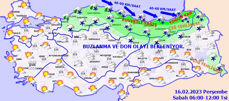 Ülkemizin kuzey, iç ve doğu kesimlerinin parçalı ve çok bulutlu, Karadeniz ile Çankırı, Sivas, Erzincan, Erzurum, Kars, Ardahan, Van ve Hakkari çevrelerinin karla karışık yağmur ve kar yağışlı geçeceği tahmin ediliyor. Yağışların; Orta ve Doğu Karadeniz kıyılarında kuvvetli ve yer yer yoğun kar şeklinde olması bekleniyor. Sabah ve gece saatlerinde iç ve doğu kesimlerde buzlanma ve don olayı ile birlikte yer yer pus ve sis bekleniyor. Doğu Karadeniz’in iç kesimlerinin yüksekleri ile Doğu Anadolu’nun eğimli ve yüksek kesimlerinde çığ tehlikesi riski bulunmaktadır.