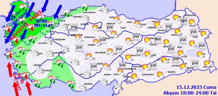 KUVVETLİ RÜZGAR UYARISI : Genellikle güneyli, kuzeybatı kesimlerde kuzeyli yönlerden esecek rüzgarın Marmara'nın batısı ve Ege kıyılarında kuvvetli ve zaman zaman kısa süreli fırtına (40 ila 70 km/saat) fırtına şeklinde etkili olması beklendiğinden yaşanabilecek olumsuz şartlara karşı dikkatli ve tedbirli olunması gerekmektedir.
