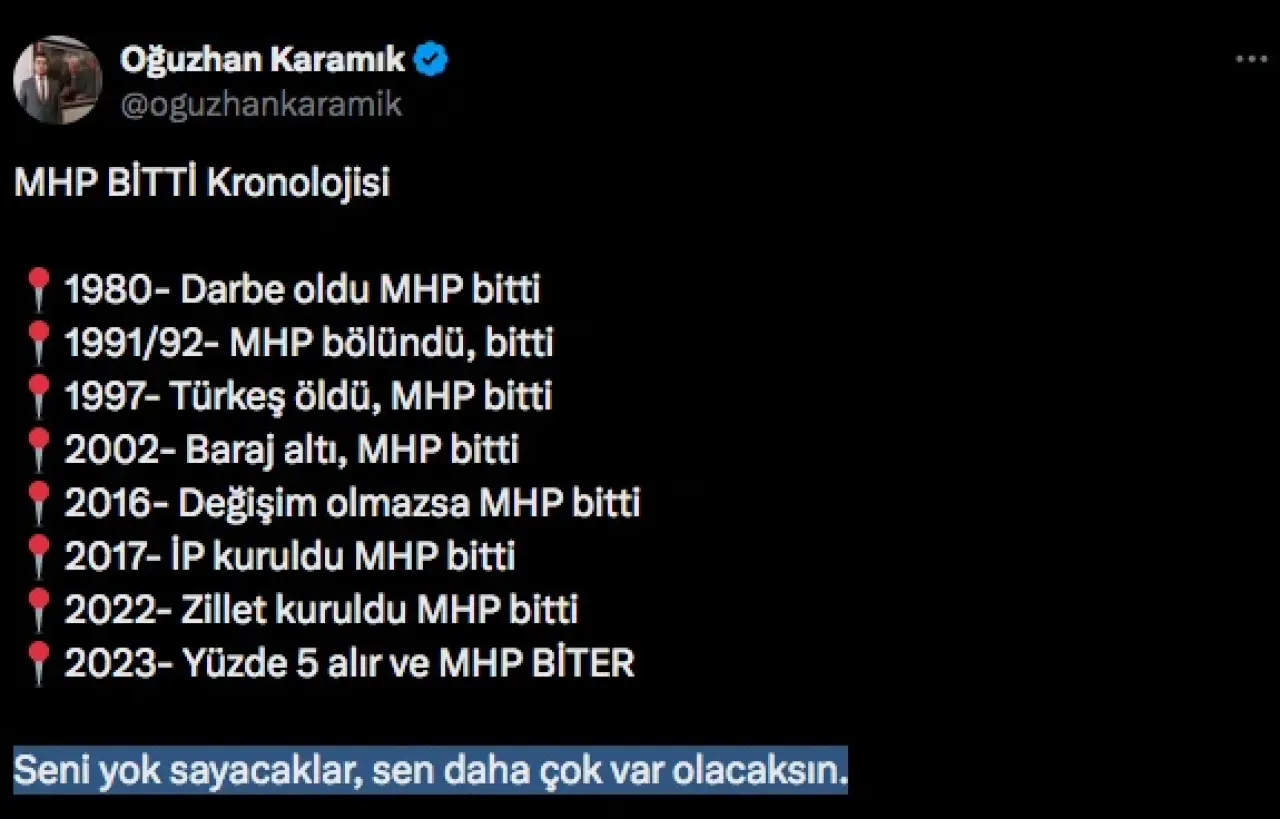Karamık, MHP’nin farklı dönemlerde karşılaştığı benzer eleştirilerle nasıl mücadele ettiğini vurguladı. Paylaşımında, “Seni yok sayacaklar, sen daha çok var olacaksın” ifadesini kullandı.