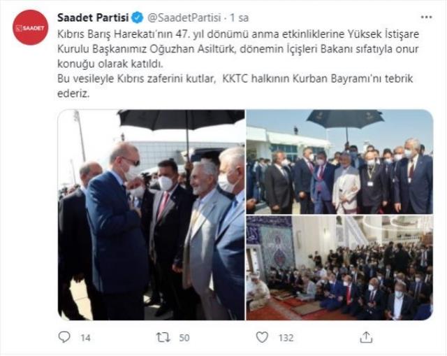 Oğuzhan Asiltürk'ün Kıbrıs ziyaretine katılmasının Saadet Partisi resmi hesabından paylaşılması da günün öne çıkanları arasındaydı. Partinin resmi hesabından yapılan açıklamada, "Kıbrıs Barış Harekatı'nın 47. yıl dönümü anma etkinliklerine Yüksek İstişare Kurulu Başkanımız Oğuzhan Asiltürk, dönemin İçişleri Bakanı sıfatıyla onur konuğu olarak katıldı. Bu vesileyle Kıbrıs zaferini kutlar, KKTC halkının Kurban Bayramı'nı tebrik ederiz" ifadelerine yer verildi.