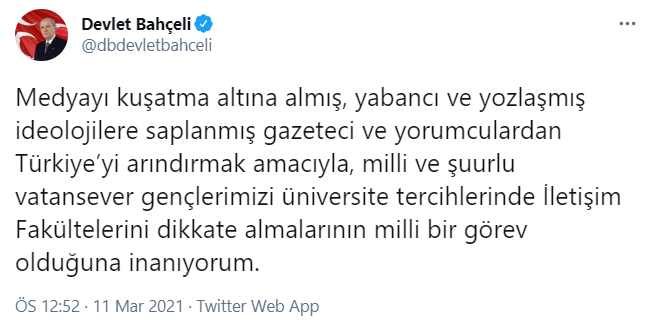 MHP Genel Başkanı Devlet Bahçeli, Twitter hesabından yaptığı paylaşımda, “Medyayı kuşatma altına almış, yabancı ve yozlaşmış ideolojilere saplanmış gazeteci ve yorumculardan Türkiye'yi arındırmak amacıyla, milli ve şuurlu vatansever gençlerimizi üniversite tercihlerinde İletişim Fakültelerini dikkate almalarının milli bir görev olduğuna inanıyorum” ifadesini kullandı.