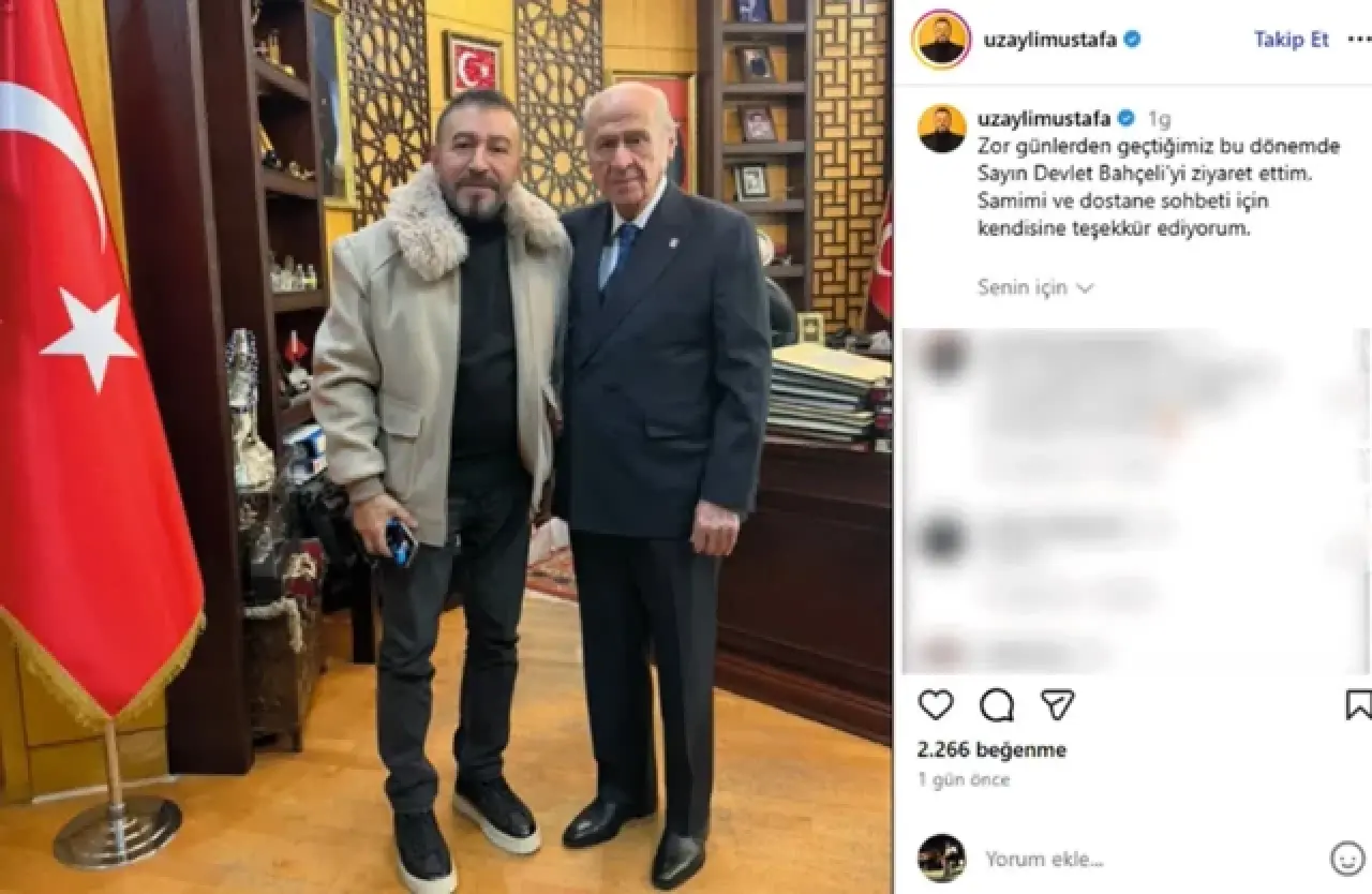 MHP Genel Başkanı Devlet Bahçeli, Ankara’daki makamında şarkıcı Mustafa Topaloğlunu ağırladı. Topaloğlu, ziyarete ilişkin fotoğrafı sosyal medya hesabından paylaşarak, Bahçeli ile gerçekleştirdiği samimi sohbetten duyduğu memnuniyeti dile getirdi.