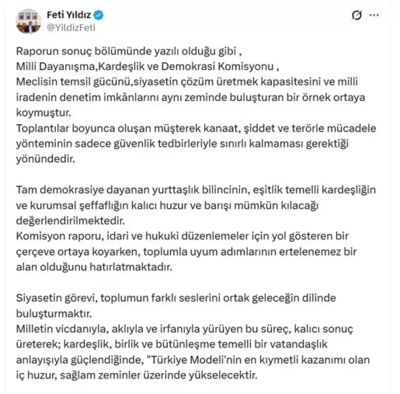Yıldız, komisyon çalışmalarında oluşan ortak kanaatin, terörle mücadelenin yalnızca güvenlik tedbirleriyle sınırlı kalmaması gerektiği yönünde olduğunu aktardı. Açıklamada, tam demokrasiye dayanan yurttaşlık bilinci, eşitlik temelli kardeşlik anlayışı ve kurumsal şeffaflığın kalıcı huzur için önemli olduğu vurgulandı.