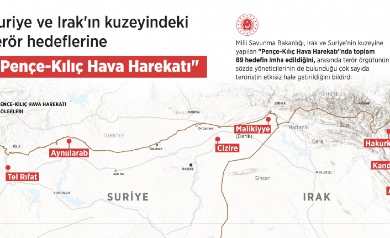 ANKARA (AA) - Milli Savunma Bakanlığı, Irak ve Suriye'nin kuzeyine yapılan "Pençe-Kılıç Hava Harekatı"nda toplam 89 hedefin imha edildiğini, arasında terör örgütünün sözde yöneticilerinin de bulunduğu çok sayıda teröristin etkisiz hale getirildiğini bildirdi.