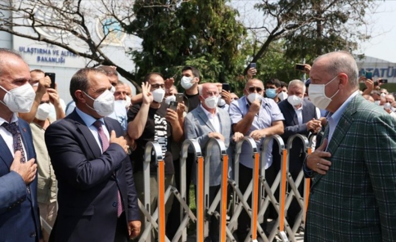 Orman yangınlarından etkilenen bölgede incelemelerde bulunmak için Antalya'ya gitmek üzere Atatürk Havalimanı'na gelen Erdoğan'ı Devlet Konukevi girişinde esnaf temsilcileri karşıladı.
