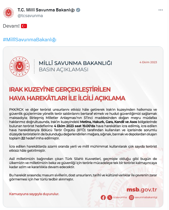 MSB tarafından yapılan yazılı açıklamada, Irak'ın kuzeyindeki Metina, Gara, Hakurk, Kandil ve Asos bölgelerinde Bölücü Terör Örgütü'ne (BTÖ) yönelik hava harekatları düzenlendiği, icra edilen hava harekatlarıyla bölücü terör örgütü tarafından kullanılan ve içerisinde sorumlu düzeyde teröristlerin de bulunduğu mağara, sığınak, barınak ve depolardan oluşan toplam 22 hedefin imha edildiği belirtildi.