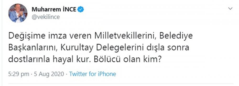 "Değişime imza veren Milletvekillerini, Belediye Başkanlarını, Kurultay Delegelerini dışla sonra dostlarınla hayal kur. Bölücü olan kim?”